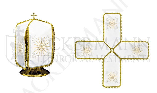 Vierarmiges Pergamentziborium aus schneeweißem Stoff, schmutzabweisende Materialien von höchster Qualität.