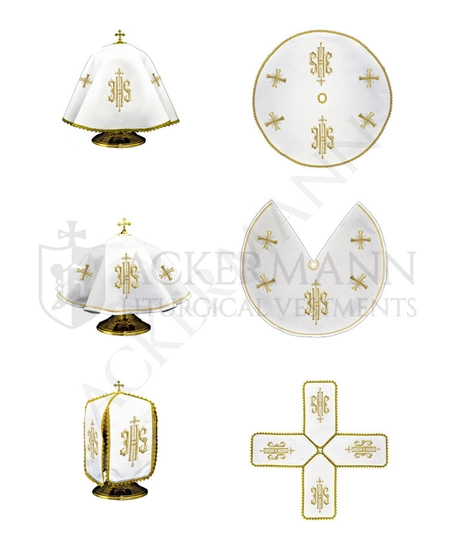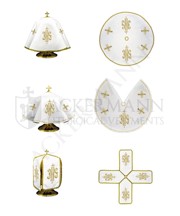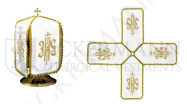Vierarmiges Pergamentziborium aus schneeweißem Stoff, schmutzabweisende Materialien von höchster Qualität.
