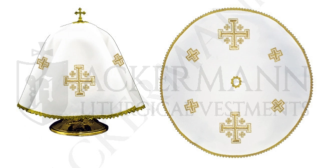 Vierarmiges Pergamentziborium aus schneeweißem Stoff, schmutzabweisende Materialien von höchster Qualität.