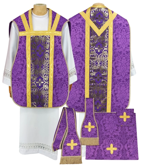 Das Set beinhaltet: Kasel, Stola, Kelchschleier, Manipel und Bursa.